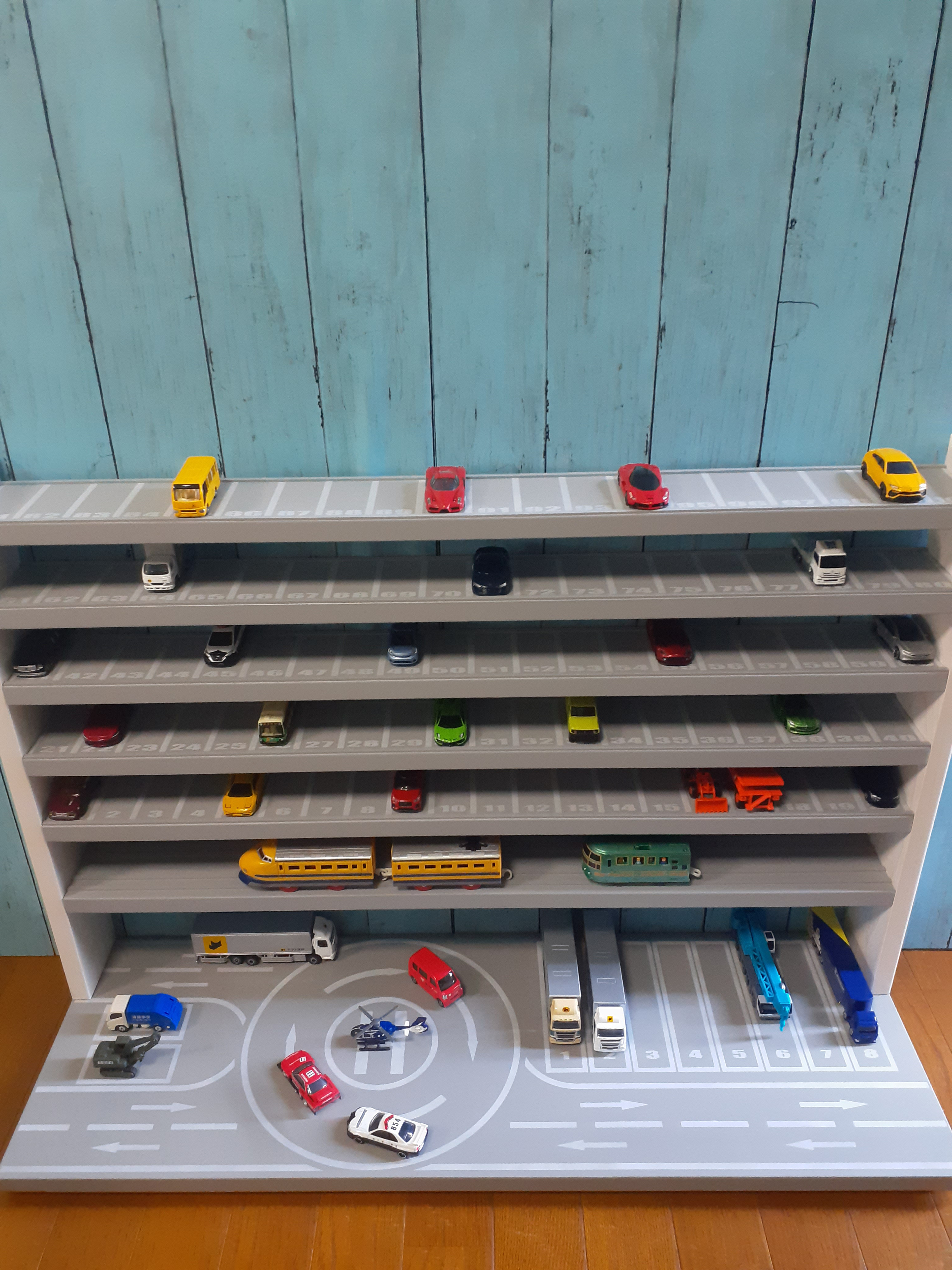 | メーカー | 最新版7段トミカプラレール収納棚1枚板仕様ヘリポート付 |