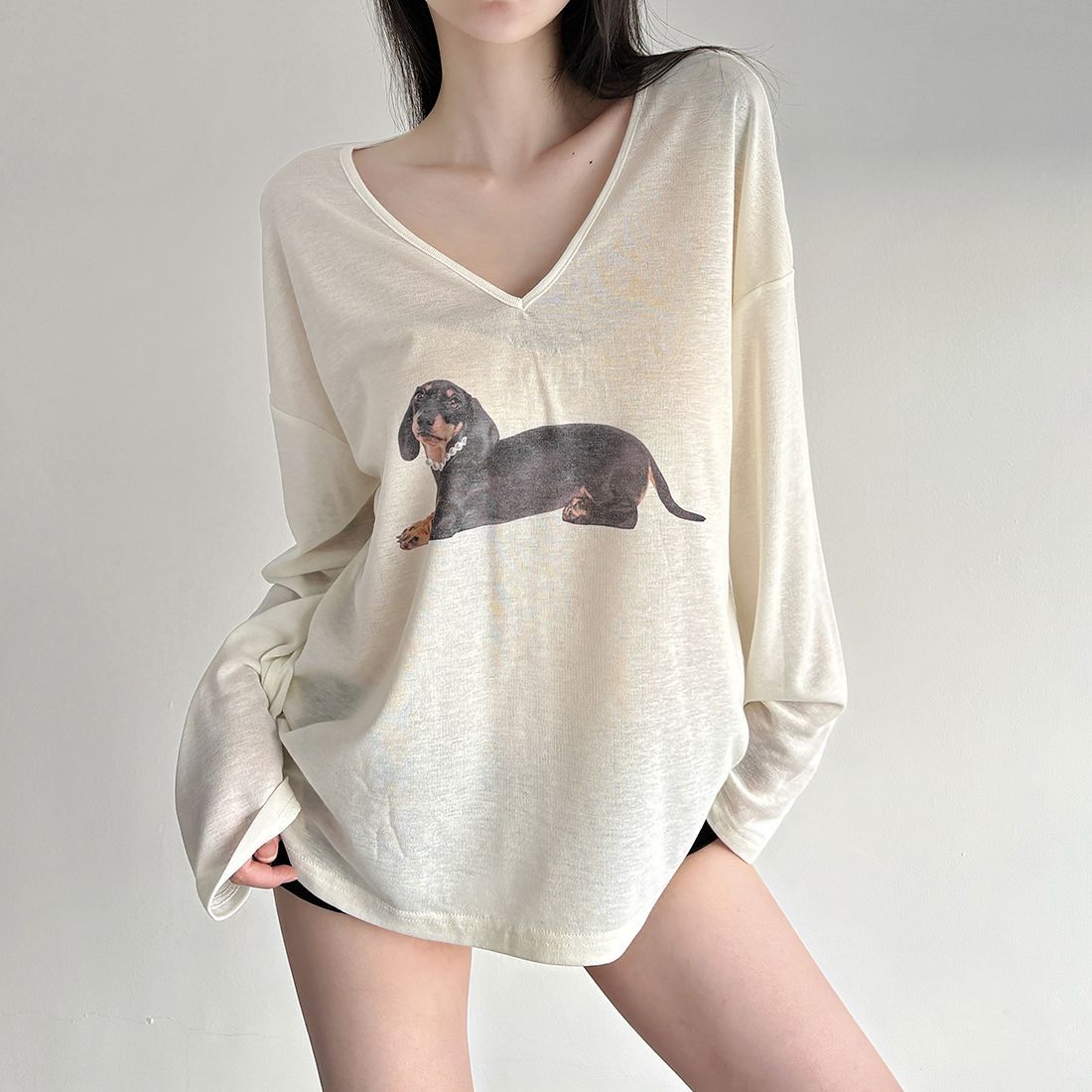 Women’s Oversized V-Neck T-Shirt with Puppy Print – Cozy & Cute